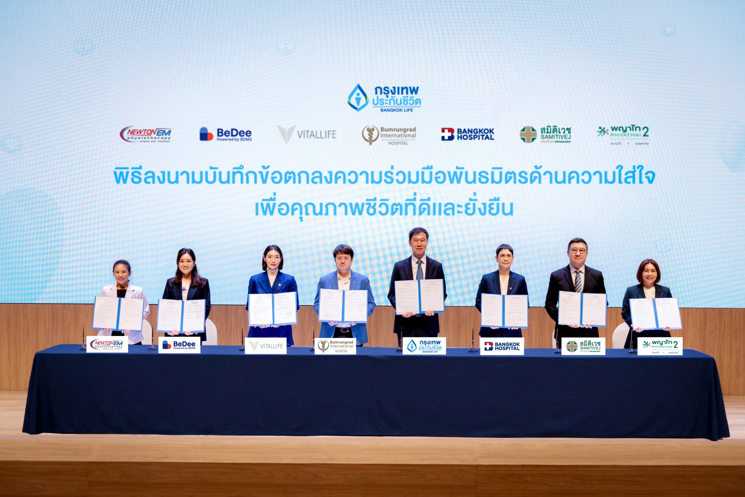 สำหรับความร่วมมือในครั้งนี้จึงเป็นอีกก้าวสำคัญของการสร้างระบบการดูแลสุขภาพแบบครบวงจร โดยได้รับความร่วมมือจากพันธมิตรด้านสุขภาพชั้นนำของประเทศ 7 องค์กร ได้แก่ 1. โรงพยาบาลกรุงเทพ สำนักงานใหญ่ 2. โรงพยาบาลบำรุงราษฎร์ อินเตอร์เนชั่นแนล 3. ศูนย์ส่งเสริมสุขภาพไวทัลไลฟ์ ในเครือโรงพยาบาลบำรุงราษฎร์ 4. โรงพยาบาลสมิติเวช ศรีนครินทร์ 5. บริษัท เฮลท์ พลาซ่า จำกัด (BeDee Application) 6. โรงพยาบาลพญาไท 2 7. บริษัท นิวตั้น เอ็ม จำกัด ซึ่งแต่ละองค์กรมีความเชี่ยวชาญในมิติที่แตกต่างกัน และเมื่อผสานศักยภาพร่วมกัน จะช่วยเติมเต็มบริการด้านสุขภาพให้ครอบคลุมทั้งการดูแลเชิงรุก การป้องกัน และการรักษาได้อย่างสมบูรณ์ อีกทั้งยังช่วยยกระดับการดูแลลูกค้าของกรุงเทพประกันชีวิตให้ได้รับบริการและสิทธิประโยชน์ด้านสุขภาพที่ครอบคลุมมากยิ่งขึ้น พร้อมสะท้อนถึงความมุ่งมั่นขององค์กรในการเป็นส่วนหนึ่งของการผลักดันสังคมไทยสู่ Longevity Society ที่ผู้คนสามารถมีชีวิตยืนยาวอย่างมีคุณภาพและมีสุขภาพที่ดีตลอดช่วงชีวิต