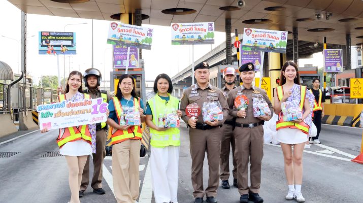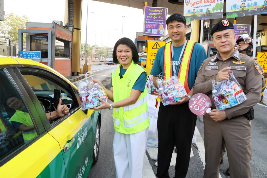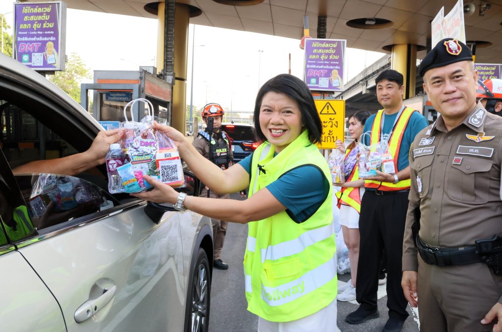 กระเป๋ากันง่วง DMT : น.ส.บงกชรัตน์ ตั้งชูกุล (คนที่3จากซ้าย) รองกรรมการผู้จัดการ สายงานธุรกิจและการเงิน พร้อมด้วย น.ส. อัจฉรา เจริญพร (คนที่2จากซ้าย) ผู้ช่วยกรรมการผู้จัดการอาวุโส สายงานพัฒนาความยั่งยืนองค์กร บมจ.ทางยกระดับดอนเมือง และคณะ ร่วมมือกับทีมตร.จราจร นำโดย พล.ต.ต.ดำรงศักดิ์ สว่างงาม (คนที่3จากขวา) ผบก.จร.และ พ.ต.อ.ณัฐพงษ์ เชื้อเดช (คนที่2จากขวา) รอง ผบก.จร. ลงพื้นที่หน้าด่านโทล์ลเวย์ มอบกระเป๋ากันง่วงซึ่งบรรจุน้ำดื่ม กาแฟ ผ้าเย็นเครื่องดื่มชูกำลังให้แก่ผู้ใช้ทางเพื่อให้ผู้ขับขี่ได้บรรเทาอาการง่วงเหนื่อยล้าระหว่างขับขี่และเดินทางกลับภูมิลำเนาถึงที่หมายโดยสวัสดิภาพในช่วงเทศกาลปีใหม่ไทย ณ ด่านดินแดง 1