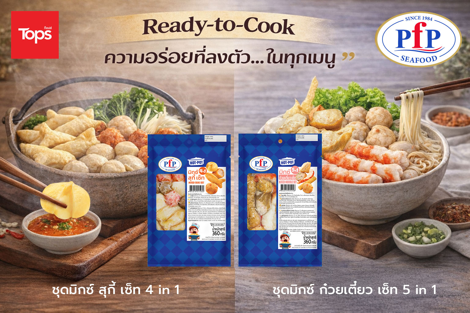 อย่างไรก็ตามเพื่อตอกย้ำความเป็น “King of Shabu” ของ PFP ที่มีความเชี่ยวชาญในกลุ่มผลิตภัณฑ์ Hot Pot ซึ่งสามารถนำไป Mix & Match กับน้ำซุปและน้ำจิ้มได้หลากหลายรูปแบบ ให้รสชาติอร่อยลงตัว ผ่านการนำเสนอสินค้าในกลุ่ม ชุดมิกซ์พร้อมปรุงขนาด 360 กรัม ที่คัดสรรวัตถุดิบหลากหลาย ครบจบในแพ็คเดียว ได้แก่ ชุดมิกซ์สุกี้เซ็ท ซึ่งประกอบด้วย เต้าหู้ชีส ลูกชิ้นปลาแซลมอน เต้าหู้ปลารูปปลา และลูกชิ้นกุ้งฮ่องเต้ ที่คัดสรรมาให้เหมาะกับเมนูสุกี้โดยเฉพาะ และ ชุดมิกซ์ก๋วยเตี๋ยวเซ็ท ซึ่งรวมลูกชิ้นหลากหลายชนิด อาทิ ลูกชิ้นแคะ ลูกชิ้นกุ้งฮ่องกง ลูกชิ้นผัก ปลาเส้นมินิ และกุ้งบาร์บีคิว