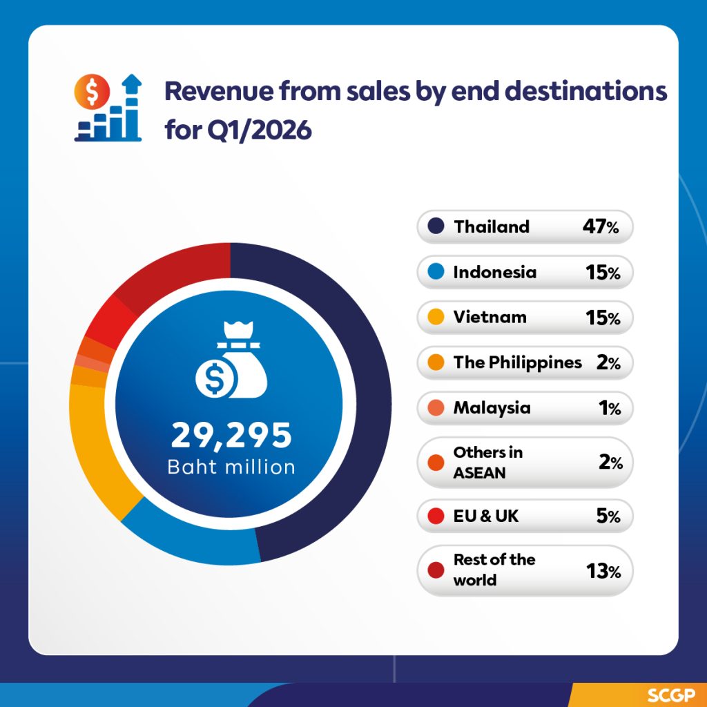 SCGP ประกาศผลประกอบการไตรมาสที่ 1 ปี 2569 กำไรเติบโต จากธุรกิจในอินโดนีเซียที่ฟื้นตัวจากการเพิ่มประสิทธิภาพการดำเนินงานและลดต้นทุน และจากแรงหนุนของการอุปโภคบริโภคในประเทศกลุ่มอาเซียน วางกลยุทธ์เชิงรุกต่อเนื่องในไตรมาสที่ 2 รับมือความผันผวนของเศรษฐกิจโลก เดินหน้าบริหารความต่อเนื่องทางธุรกิจ ควบคู่กับการเพิ่มประสิทธิภาพการผลิตและการปรับการใช้พลังงานอย่างเหมาะสม รวมถึงการนำเสนอโซลูชันเพื่อตอบโจทย์ลูกค้า (Customer Centricity)